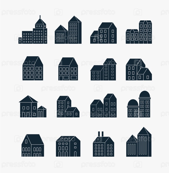 Набор икон линейных зданий, небоскребов башен - контуры городских икон