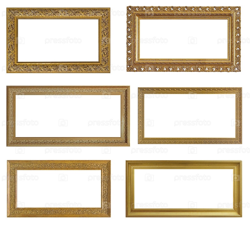 Набор золотых рамок для картин, зеркал или фотографий, изолированных на белом фоне