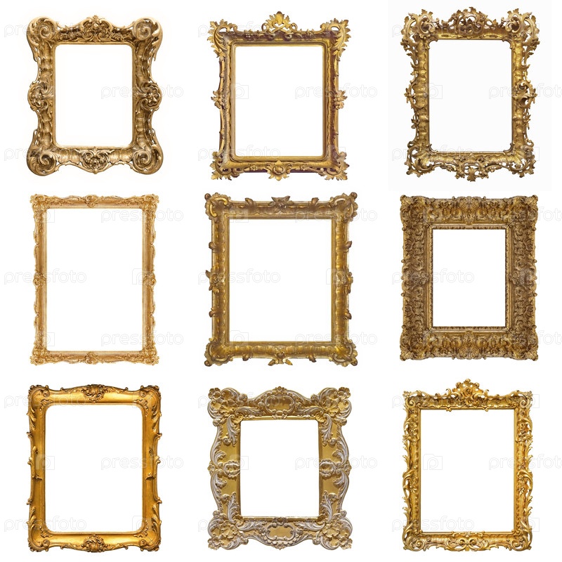 Набор золотых рамок для картин, зеркал или фотографий, изолированных на белом фоне