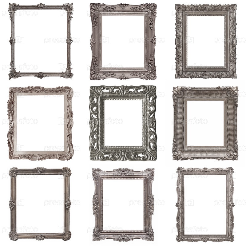 Набор серебряных рамок для картин, зеркал или фотографий, изолированных на белом фоне