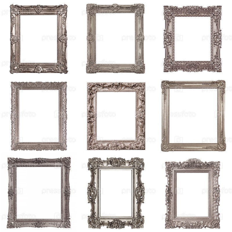 Набор серебряных рамок для картин, зеркал или фотографий, изолированных на белом фоне