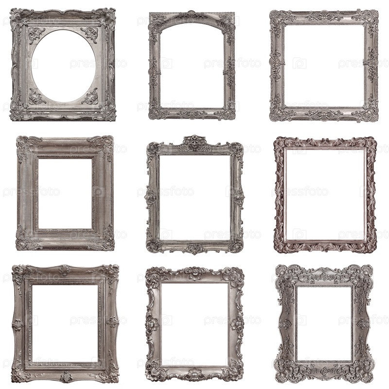 Набор серебряных рамок для картин, зеркал или фотографий, изолированных на белом фоне