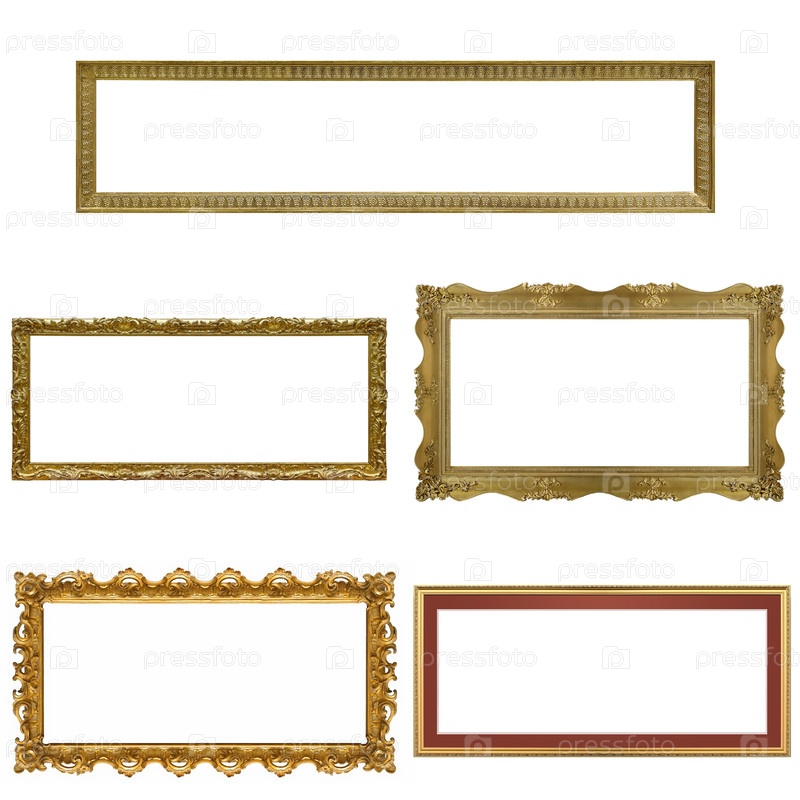 Набор золотых рамок для картин, зеркал или фотографий, изолированных на белом фоне