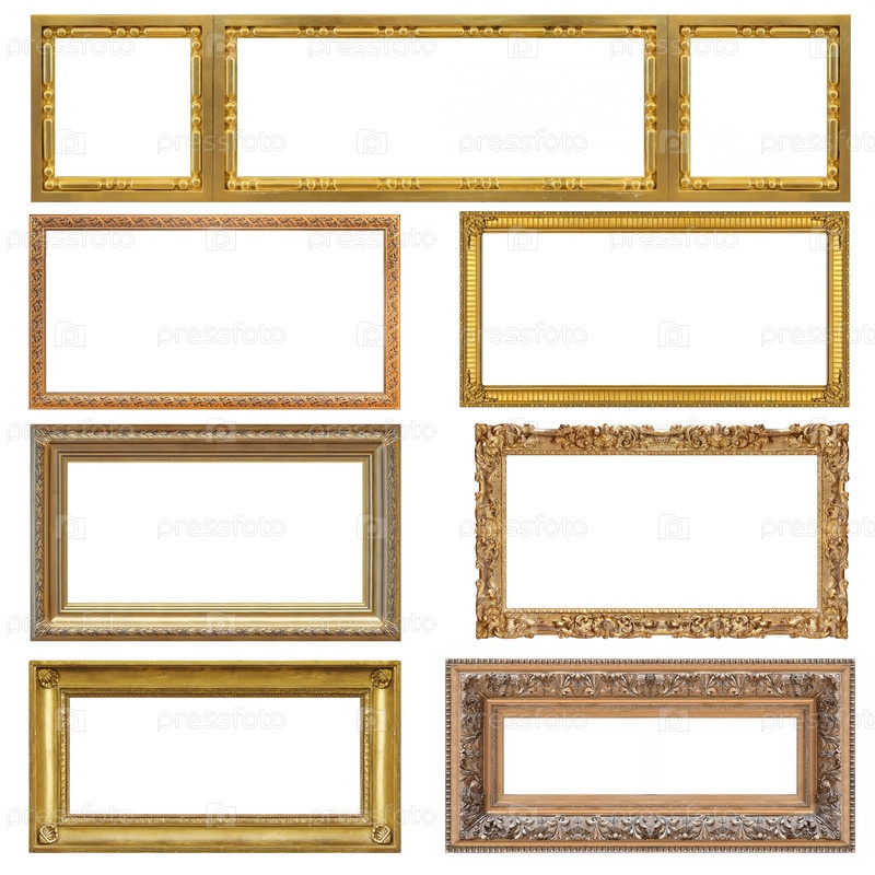 Набор золотых рамок для картин, зеркал или фотографий, изолированных на белом фоне