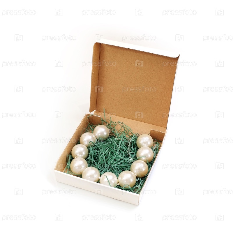 Гигантское жемчужное ожерелье в коробке для подарков, изолированное на белом фоне