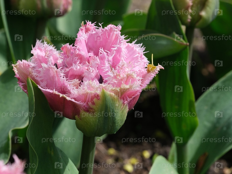 Одинокий розовый тюльпан в фокусе с размытым зеленым фоном и неоткрытыми почками, мягким естественным светом, весенний цветочный крупный план