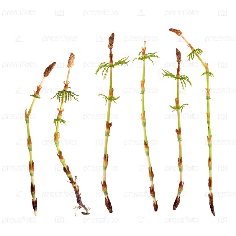 Стробилус называл конусы молодого хвоста (Equisetum sprig) Изолированные на белом фоне, вырезанные готовым изображением высокого разрешения