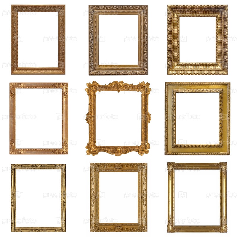 Набор золотых рамок для картин, зеркал или фотографий, изолированных на белом фоне