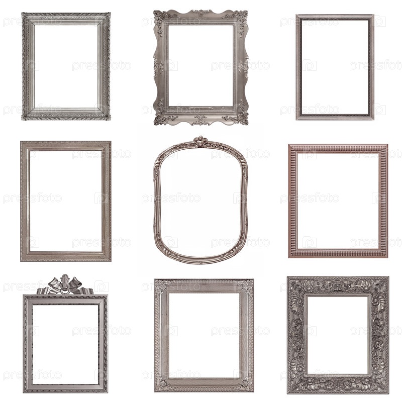 Набор серебряных рамок для картин, зеркал или фотографий, изолированных на белом фоне