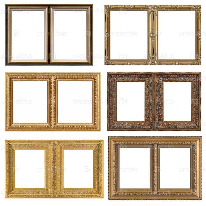 Набор золотых рамок для картин, зеркал или фотографий, изолированных на белом фоне