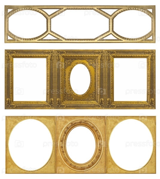 Набор золотых рамок для картин, зеркал или фотографий, изолированных на белом фоне