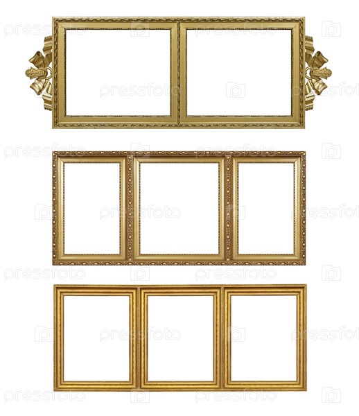 Набор золотых рамок для картин, зеркал или фотографий, изолированных на белом фоне