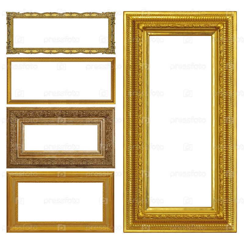 Набор золотых рамок для картин, зеркал или фотографий, изолированных на белом фоне