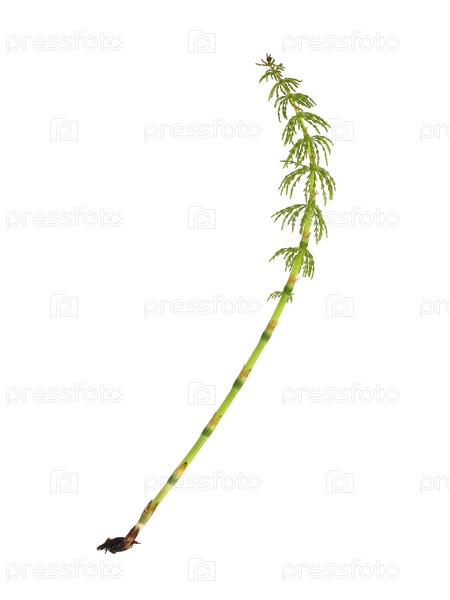 Молодой конский хвост (Equisetum) прорастает Изолированный на белом фоне, ресница готова