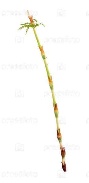 Падший стробилус, называемый конусами молодого хвоста (Equisetum) ветвица Изолирована на белом фоне, вырез готового изображения высокого разрешения
