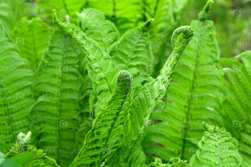 Плодоносные папоротники на солнечном свете, ярко-зеленая лиственница, макросы лесного пола