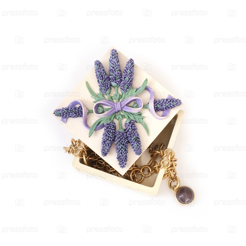Керамическая коробка, украшенная цветущей лавандой, изолирована на белом фоне