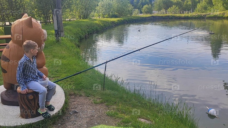 Мальчик на рыбалке, рядом кот. A boy on a fishing trip, a cat next to him