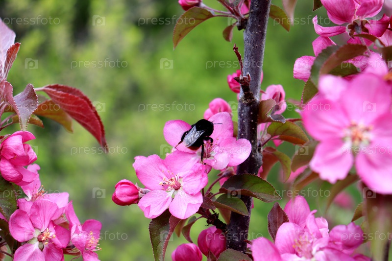 Черный шмель опыляет розовый цветок на яблоне китайского сорта Red Meat в пасмурный весенний день