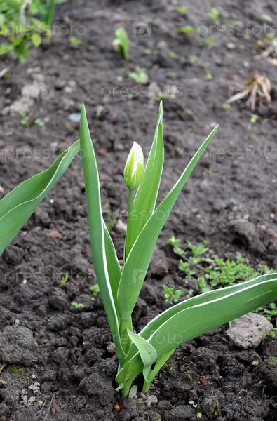 Бутон белого тюльпана на клумбе в саду в пасмурный весенний день