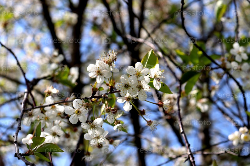 Цветущая ветвь вишневого дерева с белыми цветами в солнечный весенний день в саду на фоне голубого неба