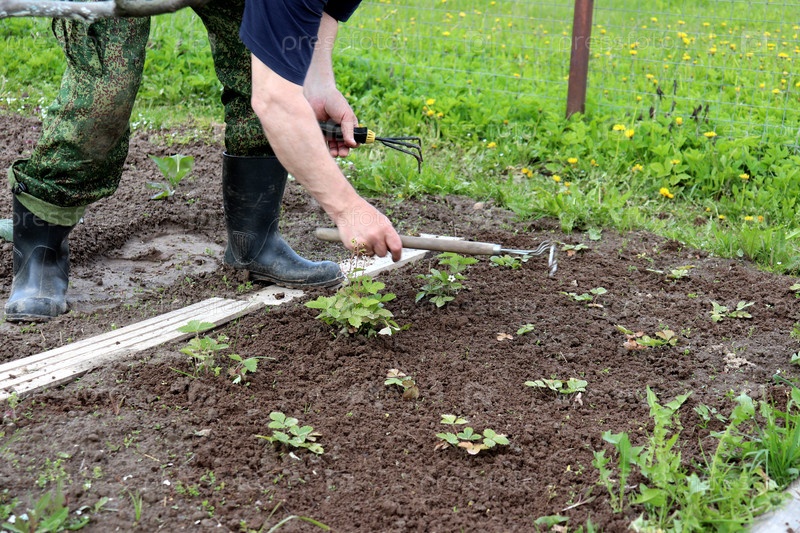 Пожилой фермер склонился над кроватью со клубничными кустами в саду на фоне сельского дома, сорвав и ослабляя почву ежей