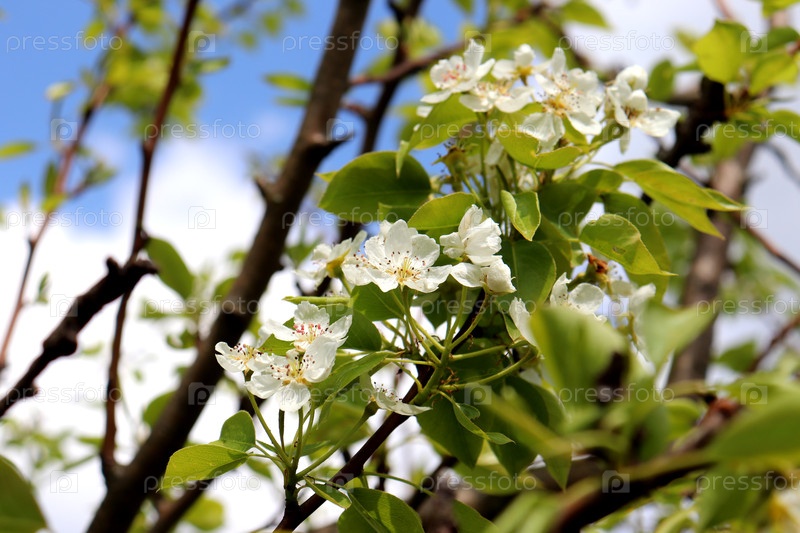 Цветущие ветви грушевого дерева с белыми цветами на фоне голубого неба в саду в солнечный день