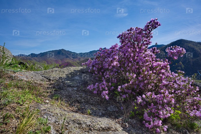 Россия. Алтайские горы. Цветущие кустарники рододендрона ledebur (маралника) на склонах гор вдоль Чуйского тракта возле деревни Купчеген