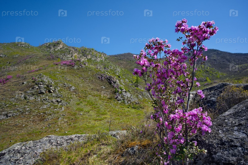 Россия. Алтайские горы. Цветущие кустарники рододендрона ledebur (маралника) на склонах гор вдоль Чуйского тракта возле деревни Купчеген
