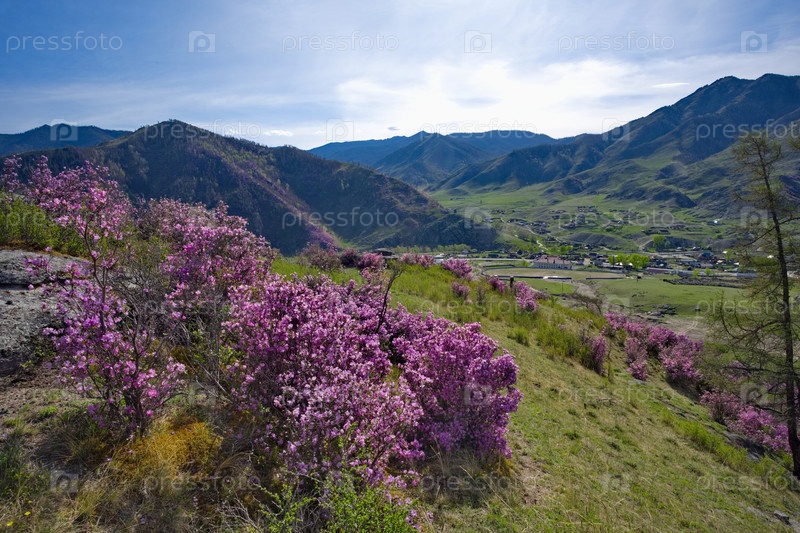 Россия. Алтайские горы. Цветущие кустарники рододендрона ledebur (маралника) на склонах гор вдоль Чуйского тракта возле деревни Купчеген