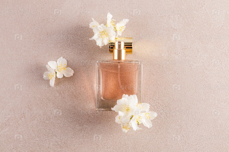 Открытая бутылка женского парфюма с ароматом цветочных ясминных нот лежит на золотой крышке среди белого жасмина
