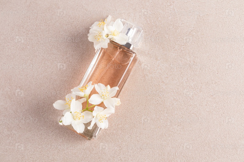 Элегантная бутылка косметики, одеколона и парфюмерии лежит на камня бежевом фоне с белыми цветками жасмина. Вид сверху. Копия пространства