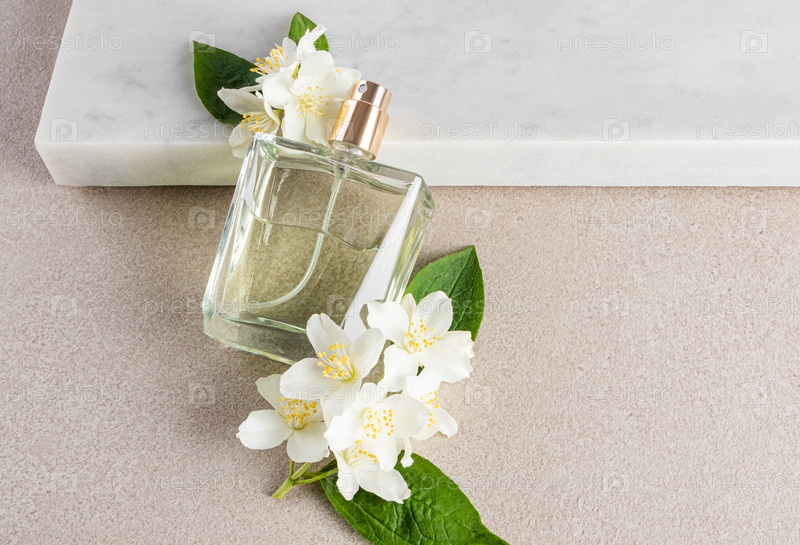 Прозрачная бутылка женского парфюма лежала на мраморном подиуме с цветками жасмина. Пустой макет небрендовой бутылки. Презентация аромата