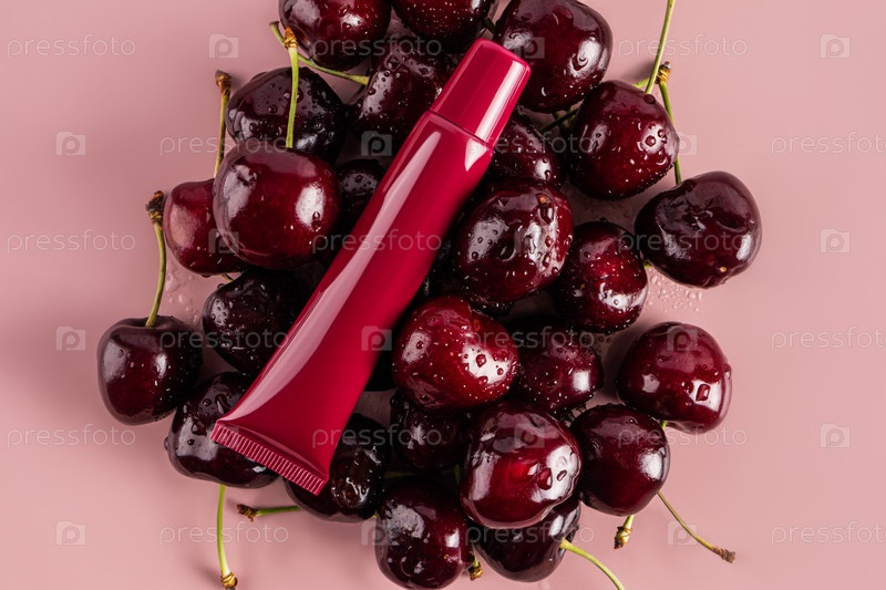 Трубка с бальзамом для губ опирается на спелые сочные вишни. Вид сверху. Пустая косметическая упаковка. Презентация продукта