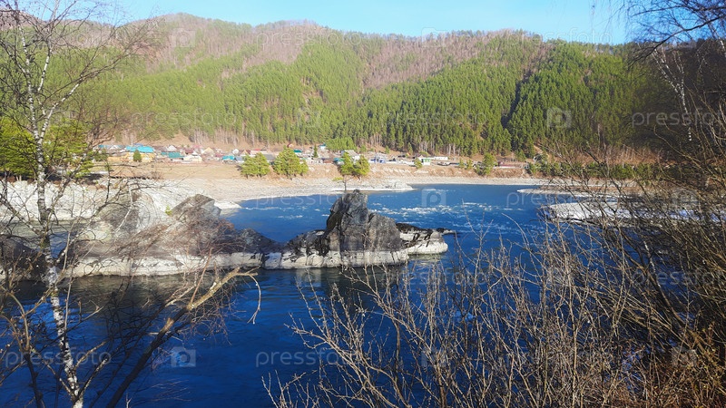Речной пейзаж с скальными образованиями и пышной зеленью днем возле небольшого сообщества