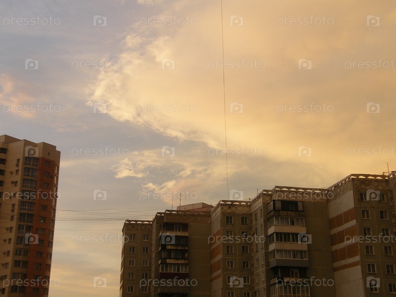 Облака захода солнца создают потрясающий фон за жилыми зданиями в городской обстановке