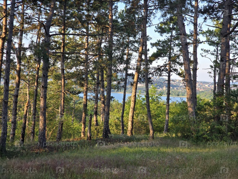 Изображение показывает лесный пейзаж. На переднем плане можно увидеть поляну с травой, а за ней густой сосновый лес. Между деревьями видна поверхность воды озера или реки, и на горизонте видны контуры города