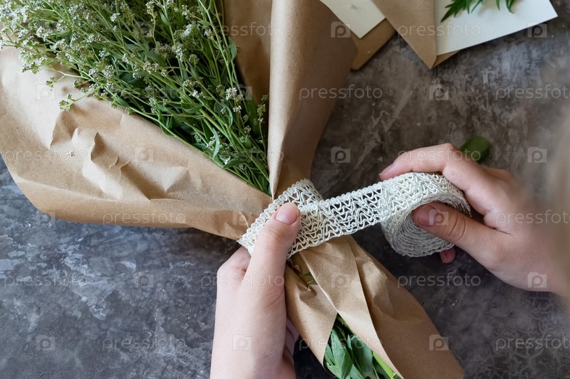 цветочник на работе: красивая женщина готовит летний букет белого гипсофила на сером столе. крафт-бумага, ножницы, приветственный конверт на столе. вид сверху. композиция плоская