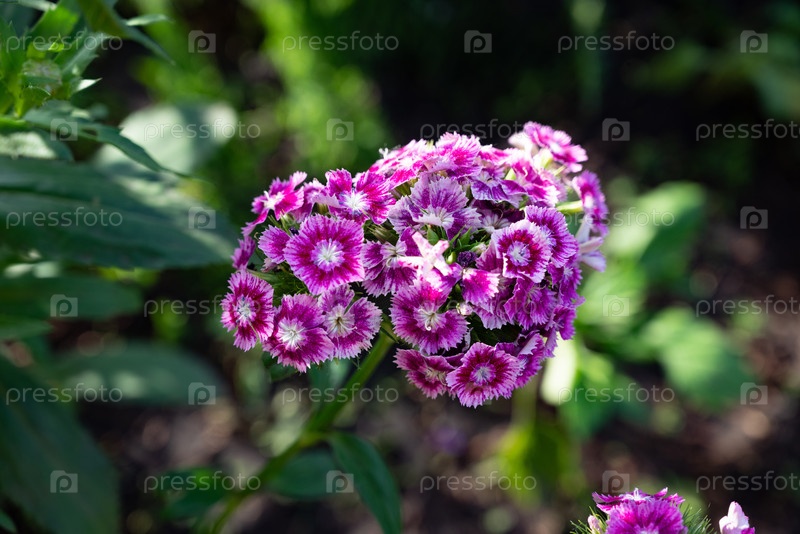 Гвоздика бородатая или турецкая, окруженная зелеными листьями в саду, создавая оживленную атмосферу в солнечный весенний день