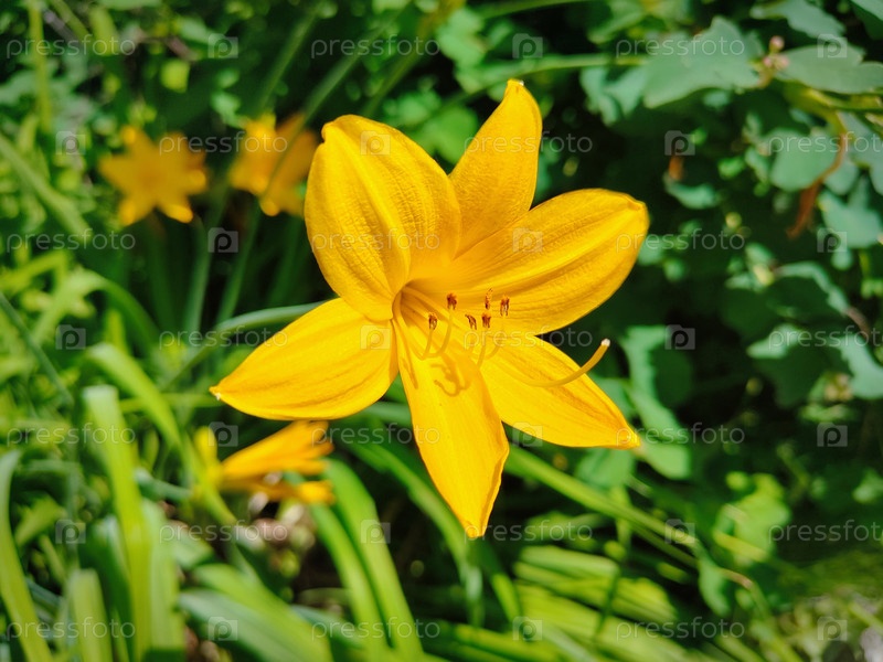Желтая лилия цветет на клумбе