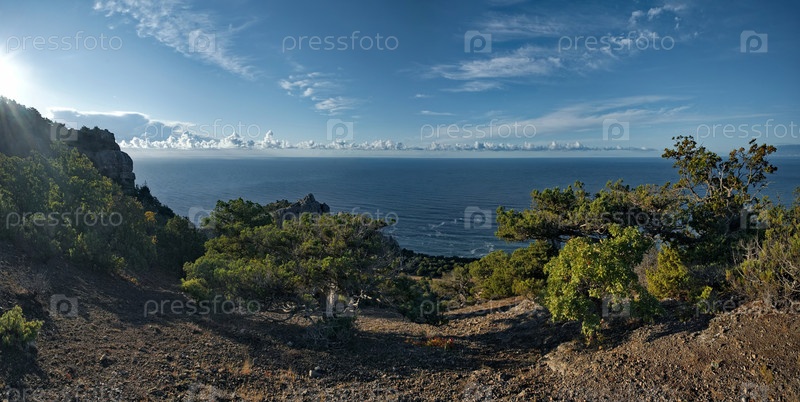 Живописный вид на побережье Черного моря с горы в окрестностях знаменитого мыса Капчик на Крымском полуострове
