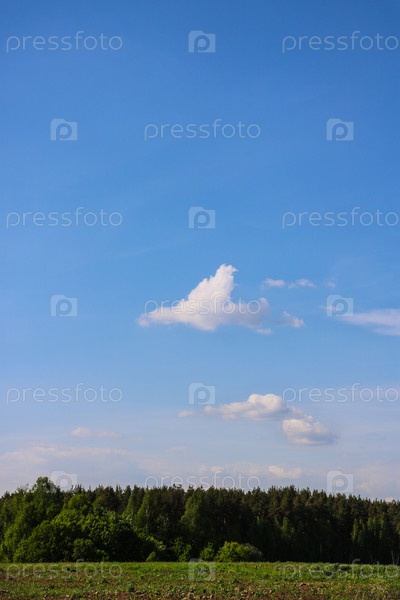 Пейзаж с ясным голубым небом, несколько облаков, поле на переднем плане и полоса леса на горизонте