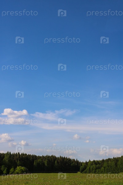 Пейзаж с ясным голубым небом, несколько облаков, поле на переднем плане и полоса леса на горизонте