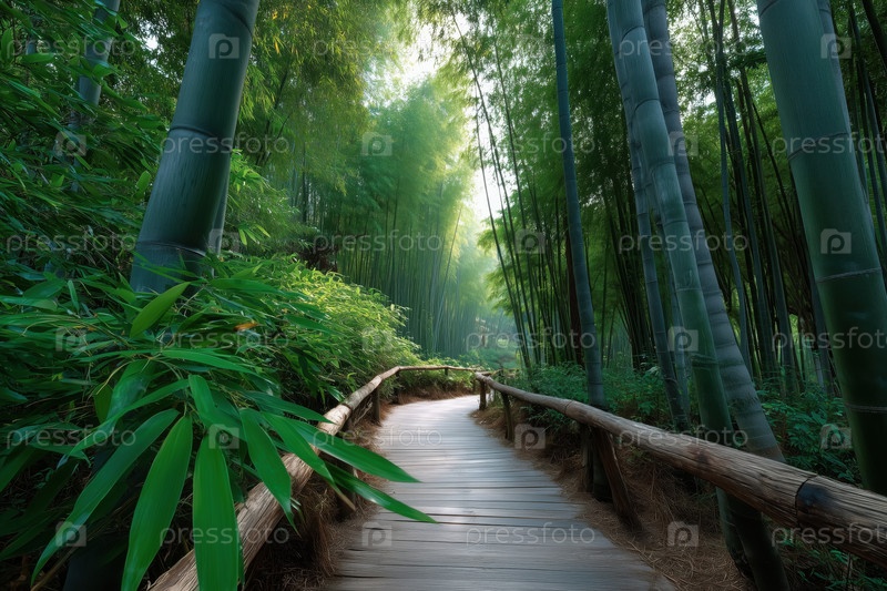 Деревянный путь с перилами ведет через бамбуковую рощу