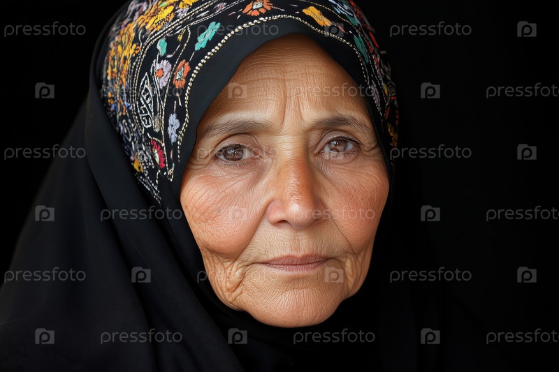 Портрет пожилой женщины в этническом шарфе на черном фоне