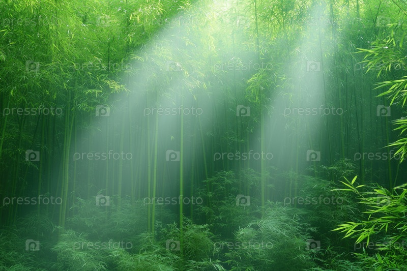 Утренняя туманная бамбуковая роща на солнце