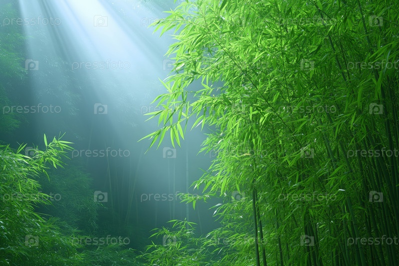 Туманный бамбуковый лес с солнечным светом