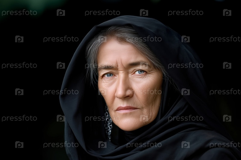 Портрет пожилой женщины в черном шарфе на чёрном фоне
