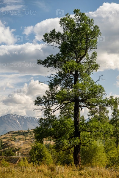 Величественный кедр в горах на фоне облаков и покрытых снегом гор