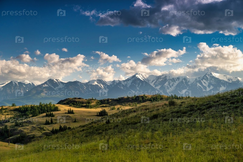 Потрясающий вид на величественные горы со снежными вершинами, окруженные ярко-зелеными лугами и чистым синим небом с пушистыми белыми облаками